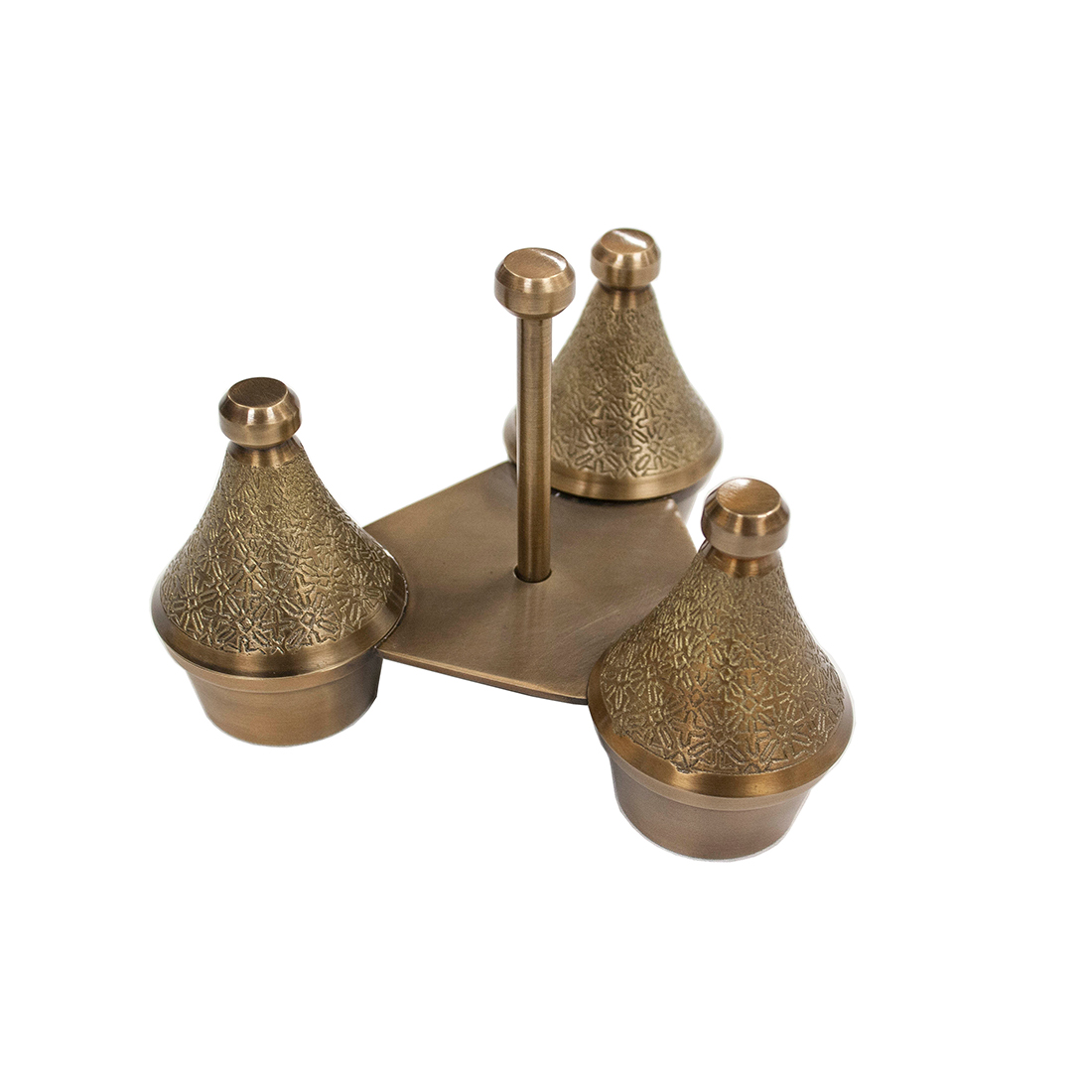 Antique brass with embossed pattern L 19.5cm x W 19.5cm x H 13.8cm Bowls – L 7cm x W 7cm x H 3cm