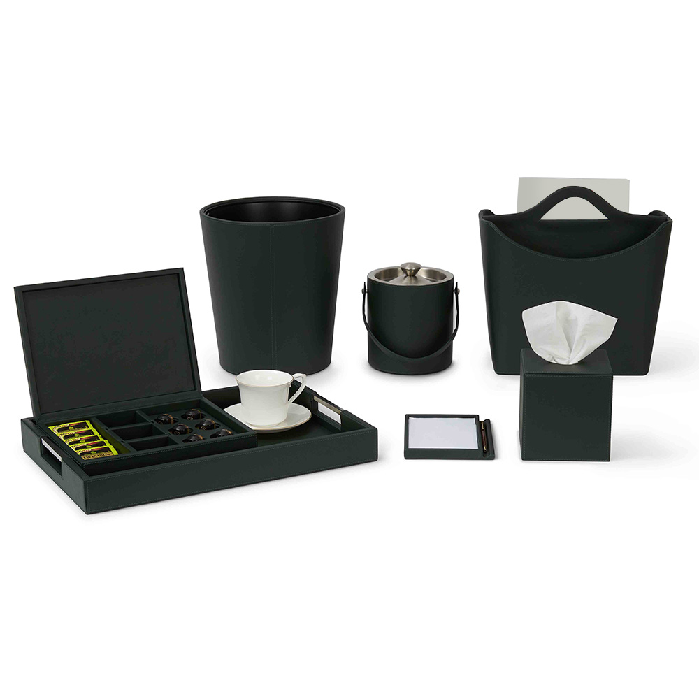 Dark green faux leather Tray – L 45cm x W 30cm x H 5cm Coffee Box – L 27cm x W 20.5cm x H 6cm Waste Bin – L 25cm x W 25cm x H 34cm Ice Bucket – L 15.5cm x W 15.5cm x H 16.5cm Notepad Holder – L 17cm x W 13.5cm x H 2cm Magazine Holder – L 33.5cm x W 15.5cm x H 32cm Tissue Box Holder – L 13cm x W 13cm x H 14cm