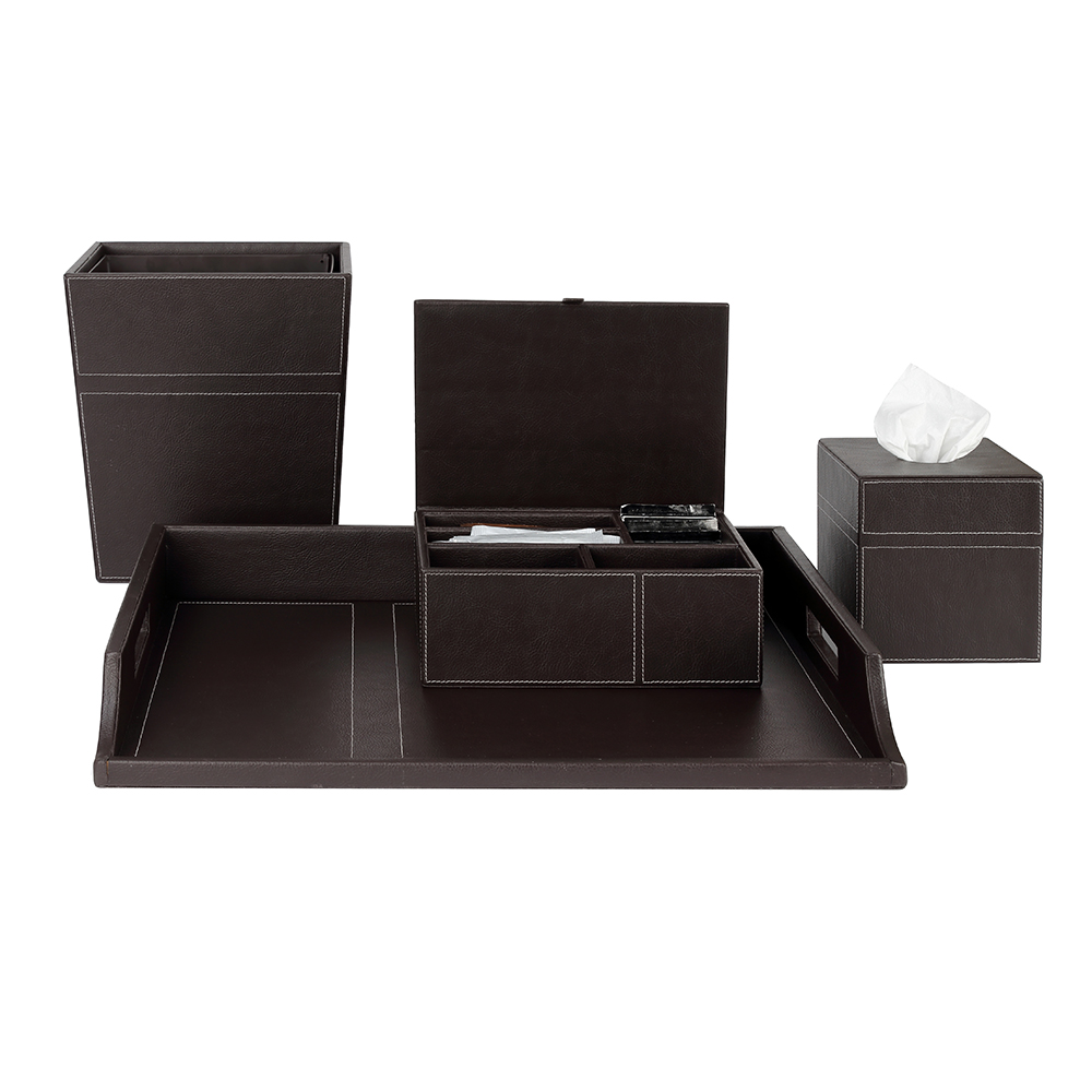 Brown faux leather with white stitch Waste bin – L 22cm x W 22cm x H 25cm Tissue box – L 13cm x W 13cm x H 13cm Condiment box – L 23cm x W 16.5cm x H 9cm Tea & coffee tray – L 48cm x W 38cm x H 6.5cm *All sizes are approximate
